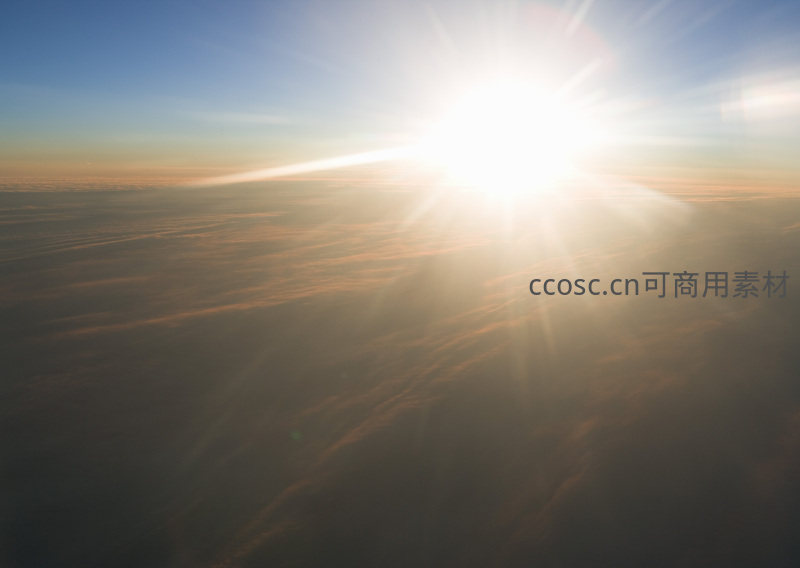 从万米高空俯瞰,太阳初升,金色光芒穿透云层,将整片云海染成温暖的橙红色,带来壮丽而宁静的视觉体验。