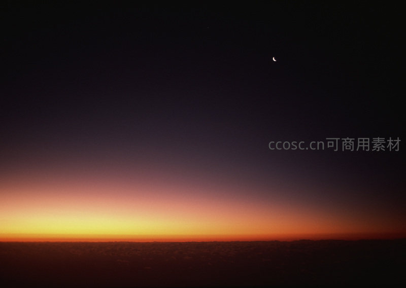 一弯新月优雅悬挂于深邃夜空,地平线被夕阳余晖染成橙红色,云层暗影勾勒出天地交界的宁静之美。