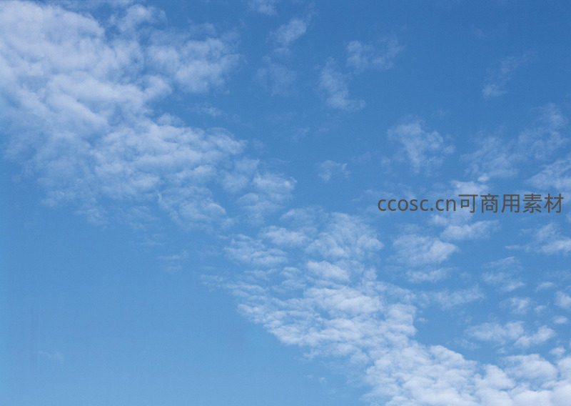 少量散落的云絮轻盈地点缀在广阔的蓝色天幕上,构图简洁,色彩明快,传递出轻松、自由与宁静的意境。