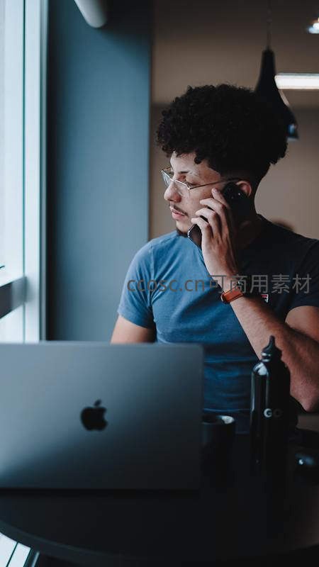 年轻男子窗边通话专注工作时刻
