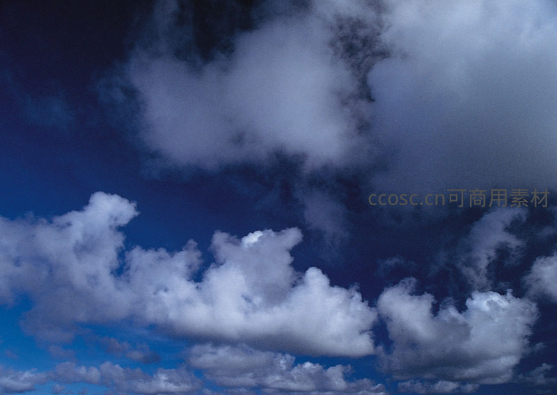 大片蓬松的积云在湛蓝天空中翻腾涌动,层次分明,光影交错,展现出大自然瞬息万变的磅礴力量与美感。