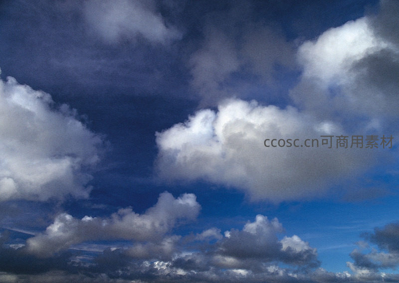 深邃的蓝色天空背景下,形态各异的白色云朵轻盈漂浮,光影交错间展现大自然的宁静与壮美,是理想的自然风光背景素材。