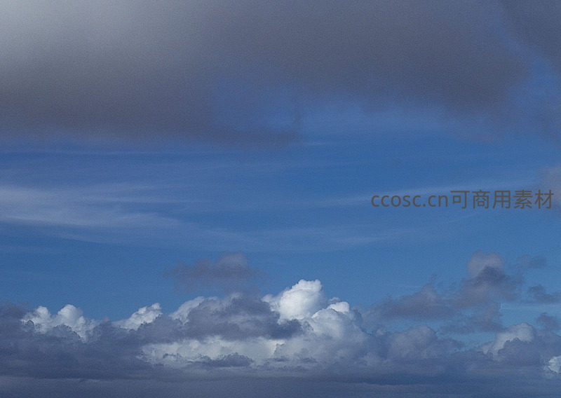 厚重的积云堆积在画面下方,上方是清澈的蔚蓝天空,强烈的明暗与色彩对比展现出大气的层次感和自然力量的震撼之美。