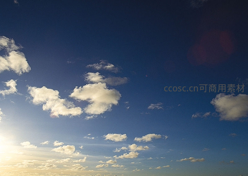 湛蓝的天空下,洁白蓬松的云朵悠然飘动,阳光从一侧洒下,为云层镶上金边,营造出宁静而开阔的视觉感受。