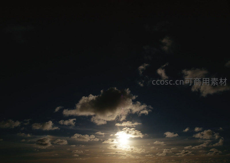 深蓝色的暮色天空中,几缕云朵被夕阳染成金边,勾勒出太阳的轮廓,充满诗意与宁静感。