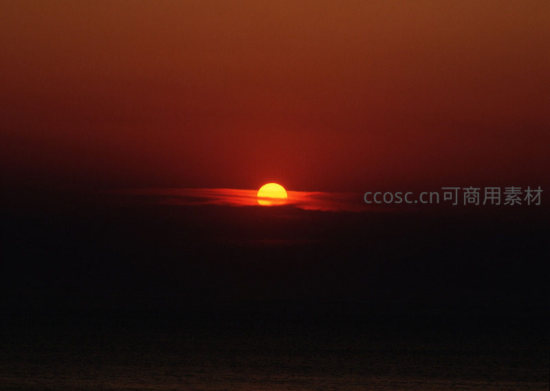 一轮红日缓缓沉入海平面之下,天空被染成深邃的橘红色,海面波光粼粼,整个画面充满了静谧与壮丽的氛围。