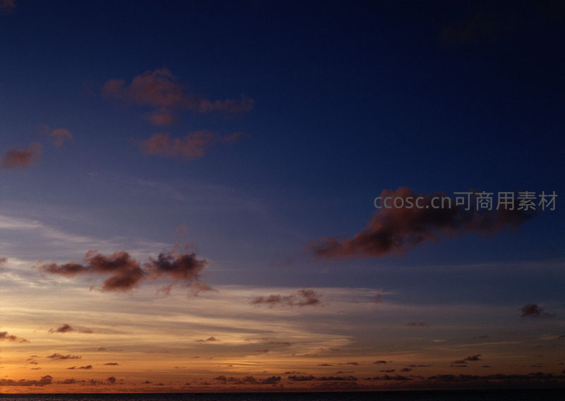 深邃的蓝色天幕下,橙红色霞光在地平线燃烧,零散云朵被镀上暖色,形成强烈色彩对比,尽显自然之壮阔与静谧。