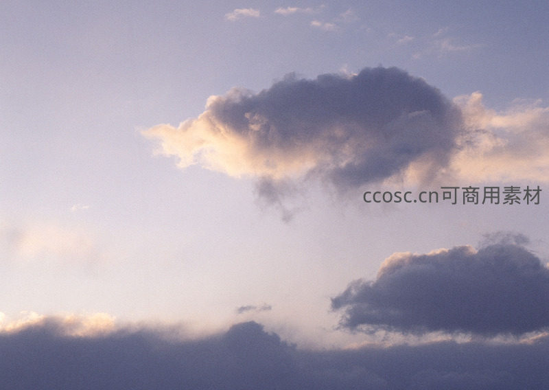 蓬松的云朵在淡紫色的天空中悠然飘浮,边缘被夕阳镀上一层柔和的金边,整体画面宁静、纯净,如同一幅水彩画般温柔地抚慰人心。
