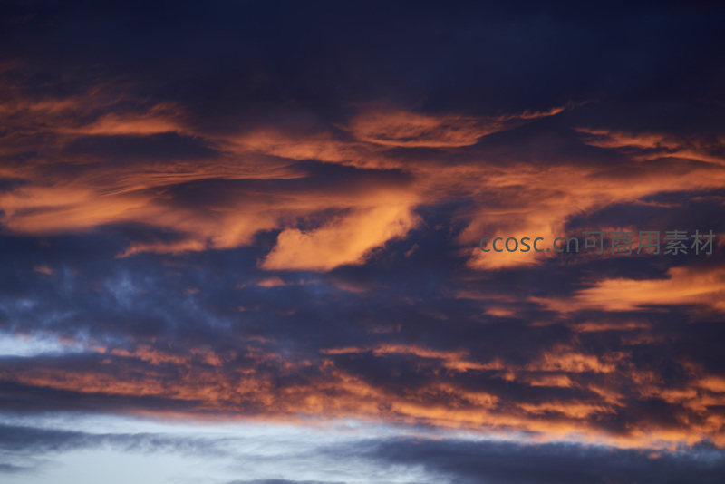 厚重云层被夕阳点燃,如熔岩般流淌在深蓝色天幕之上,光影交错间展现自然之力,带来心灵深处的震撼与宁静。