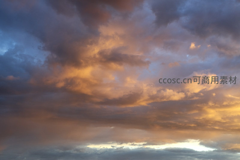 夕阳余晖洒向厚重云层,金色光芒穿透云隙,将天空染成温暖的橘红色调,营造出宁静而震撼的视觉体验。