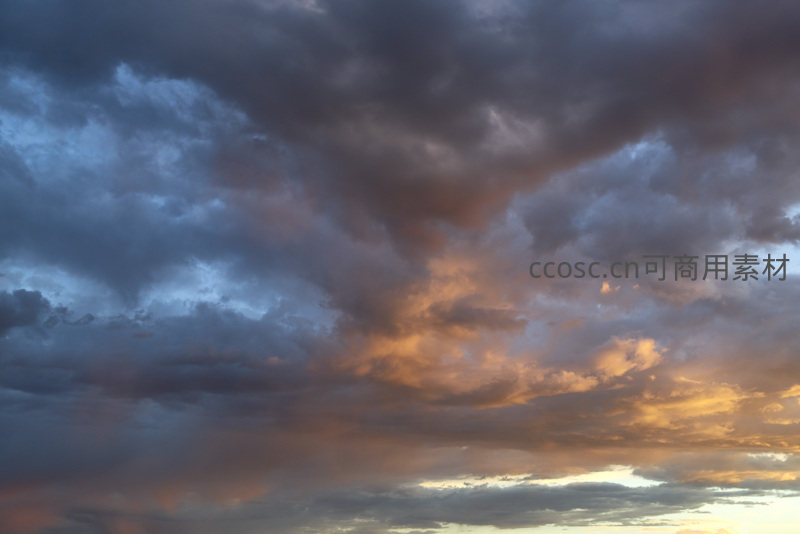 厚重的灰蓝色云团在日落时分被边缘霞光点亮,形成强烈冷暖对比,展现出天空瞬息万变的磅礴气势与自然之美。