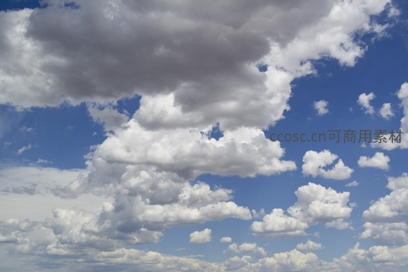 蔚蓝的天空中漂浮着蓬松洁白的云朵,层次分明,光影交错,展现出大自然宁静而壮丽的景象,令人心旷神怡。