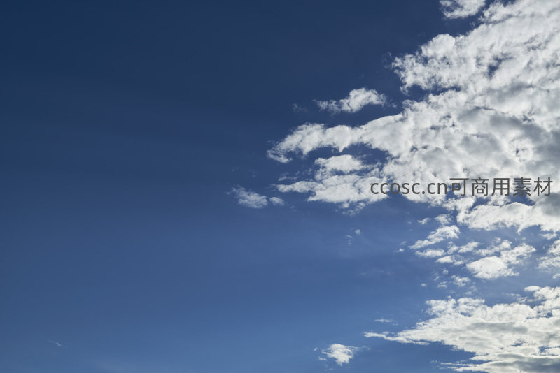 纯净的深蓝色天空中,洁白蓬松的积云在右上角轻盈飘动,阳光明媚,视野开阔,令人心旷神怡。