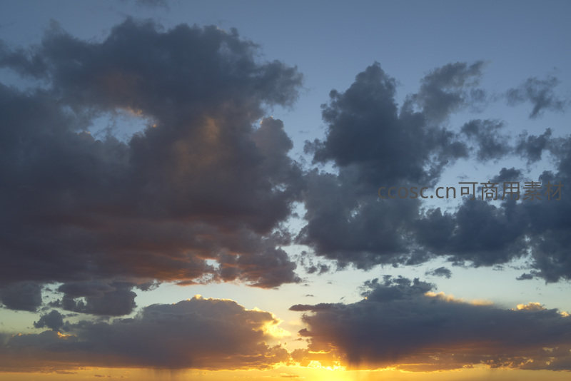 夕阳西下,金色光芒穿透厚重云层,在天空中勾勒出绚丽的晚霞,营造出宁静而壮美的自然景象。