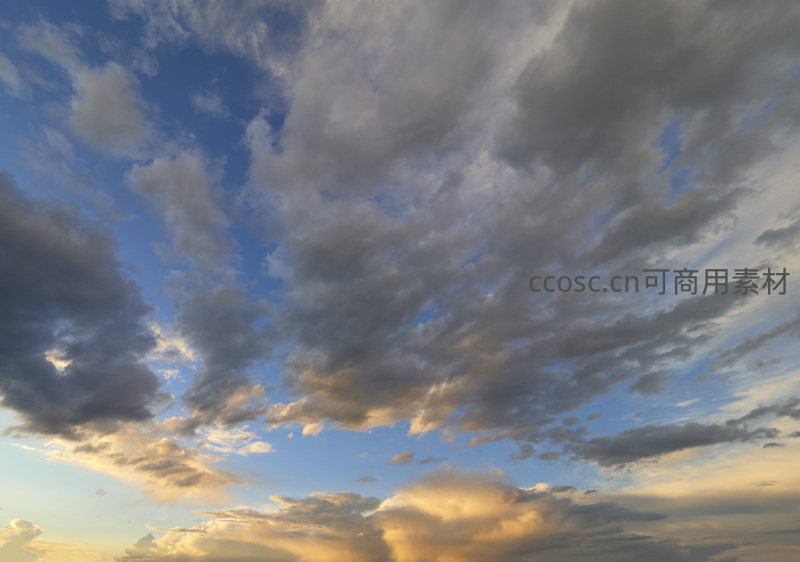夕阳西下,大片云层被染成金黄与深灰相间的波涛,光影交错间尽显天空的磅礴气势与变幻莫测的视觉盛宴。