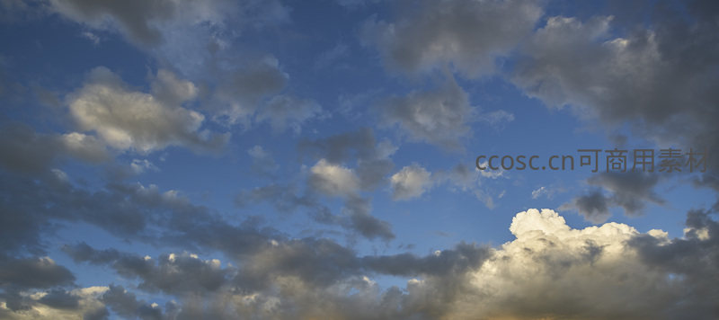 广阔的蔚蓝天空中,蓬松洁白的云朵与深灰色积云交织,阳光穿透云层洒下金色光芒,构成一幅宁静而壮丽的自然画卷。