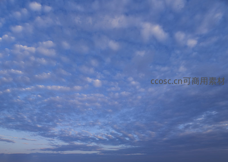 整片天空被细腻如棉絮般的高积云覆盖,呈现出柔和的淡蓝色调,云朵间透出微弱的暖光,整体氛围清新、平静且富有层次感。