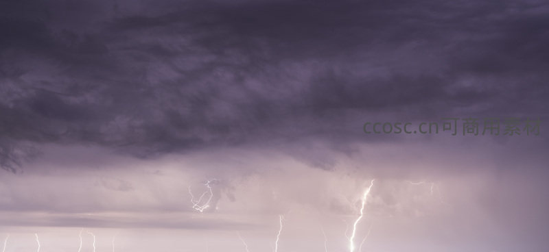 深紫色的积雨云低垂压顶,多道明亮的闪电在云层间与云地间同时迸发,营造出紧张而壮观的天气景象。