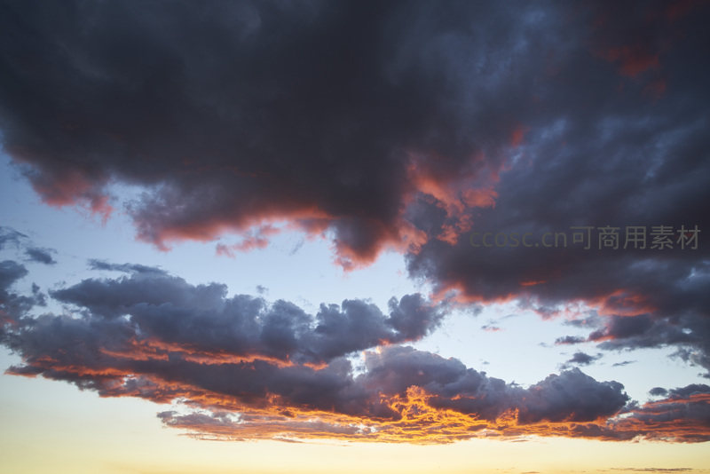 黄昏时分,浓重的灰色云团翻滚于天际,底部被落日余晖染成绚烂的橙红色,明暗对比强烈,极具视觉冲击力。
