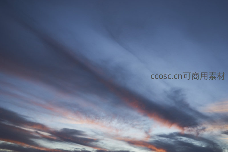 夜幕降临前的壮丽景象,深蓝色的天空中,一条条橙红色的云带如火焰般燃烧,勾勒出天地交接的宏伟轮廓。