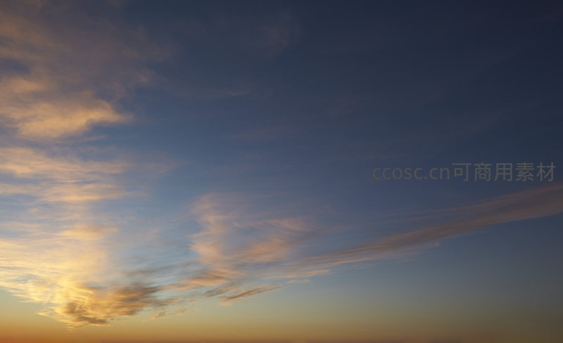 夕阳西下,天空被染成金黄与深蓝交织的画卷,轻盈云朵如丝如缕,展现大自然瞬息万变的宁静与壮美。