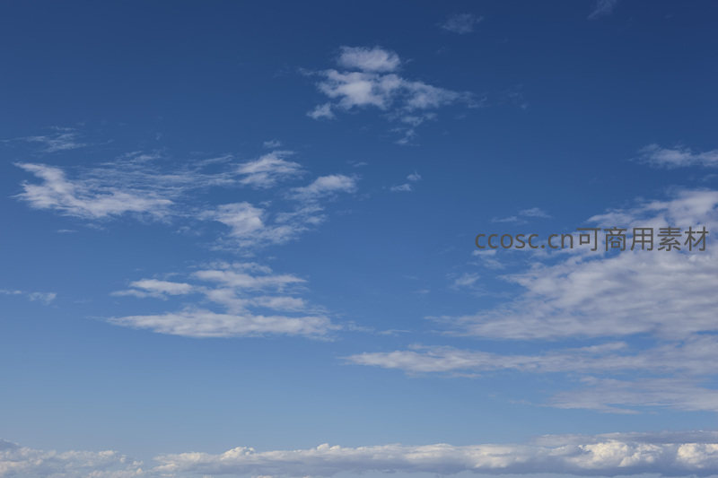 清澈透亮的蓝色天空下,稀疏的白色云絮若隐若现,构成一幅简约而优雅的画面,适合用于表达平和、自由与无限遐想的意境。