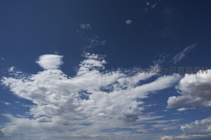 深邃的蓝色天空背景下,蓬松洁白的云朵自由舒展,形态各异,光影交错,营造出宁静而开阔的视觉感受。