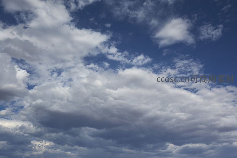 广阔无垠的蔚蓝天空中,洁白蓬松的云朵悠然飘浮,形态各异,光影交错,营造出宁静祥和的自然氛围。