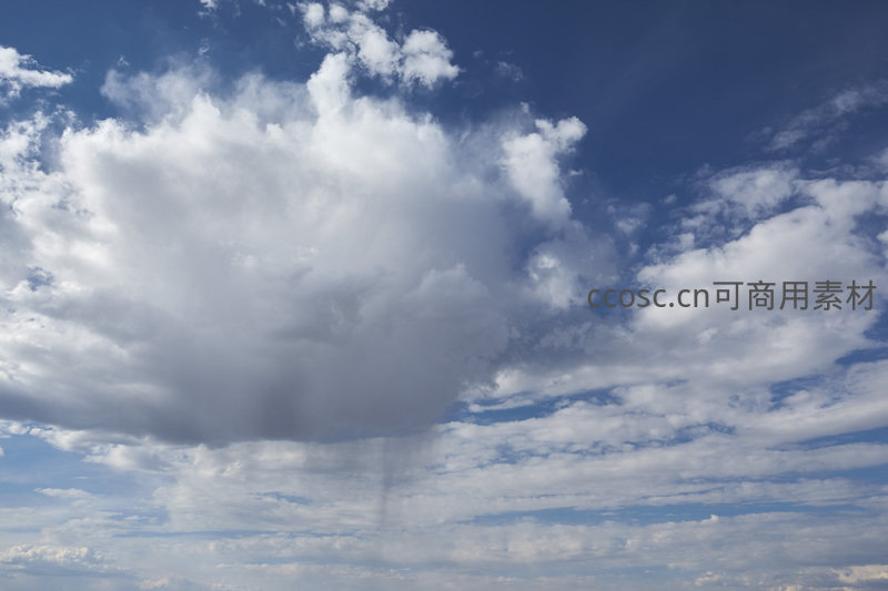 轻盈如棉絮的白云在澄澈的蓝天中自由飘荡,部分云体下方有细雨垂落,动静结合,展现大自然瞬息万变的诗意之美。