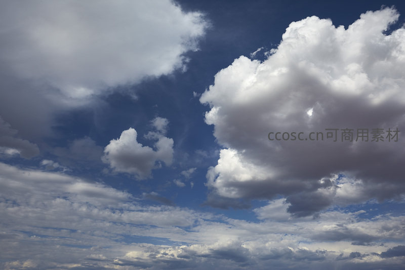 形态各异的云朵在深邃的蓝色画布上自由飘荡,从轻盈的絮状到厚重的团块,构成一幅富有动感和层次感的天然画卷。