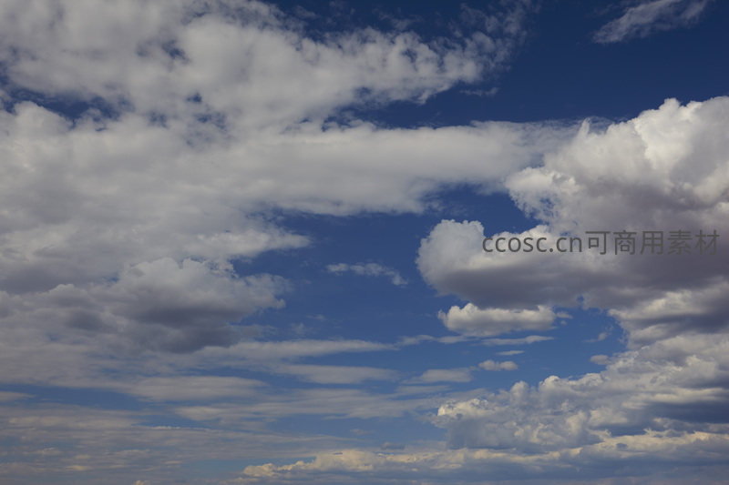 淡蓝色的天空中散布着形态各异的云朵,有的轻盈如絮,有的厚实如山,随风缓缓流动,呈现出自由舒展、宁静悠远的意境。