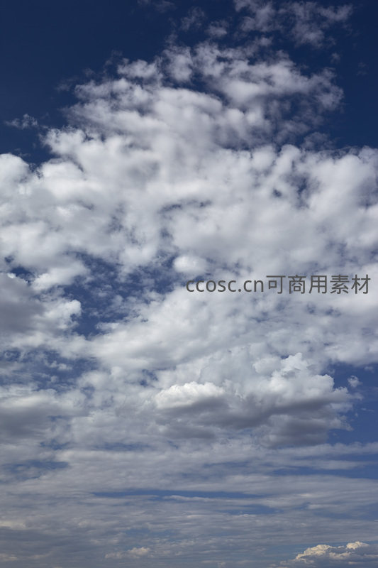 蔚蓝的天空中漂浮着形态各异的白色云朵,层次分明,光影交错,展现出大自然宁静而壮美的瞬间。