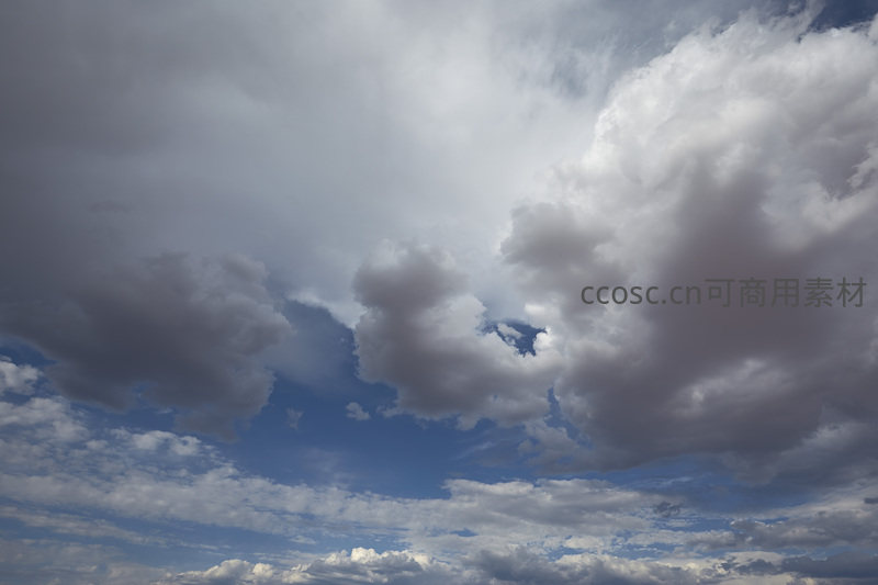 厚重的积雨云在蔚蓝天空中翻滚,阳光穿透缝隙洒下光柱,营造出戏剧性的视觉效果,展现了大自然瞬息万变的力量与美感。