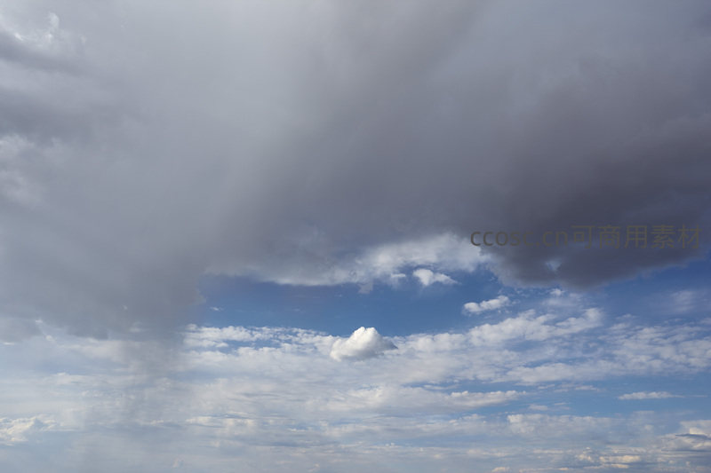 浓密云层如山峦起伏,下方薄云轻盈飘逸,层次分明。灰白与湛蓝交织,展现大气流动之美,令人感受天地之广阔与自然之磅礴。