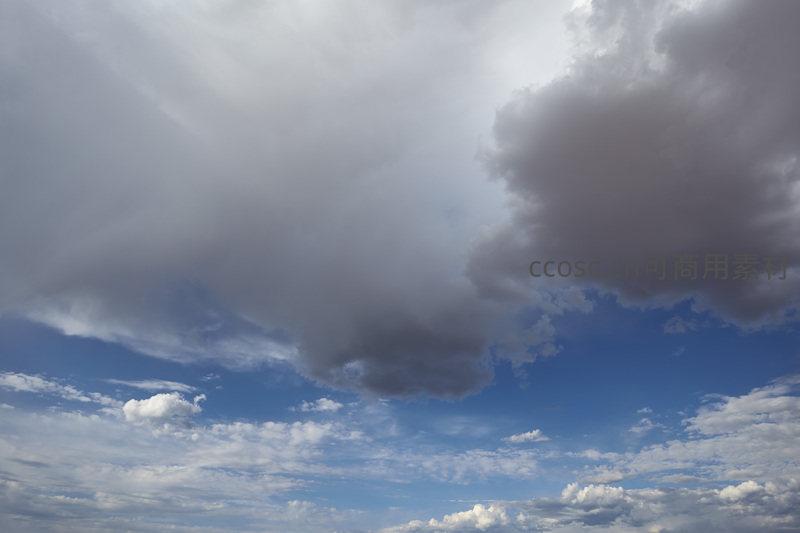 蔚蓝天空中,洁白蓬松的云朵与深灰色积雨云层交相辉映,光影变幻间展现出大自然瞬息万变的壮美景象。