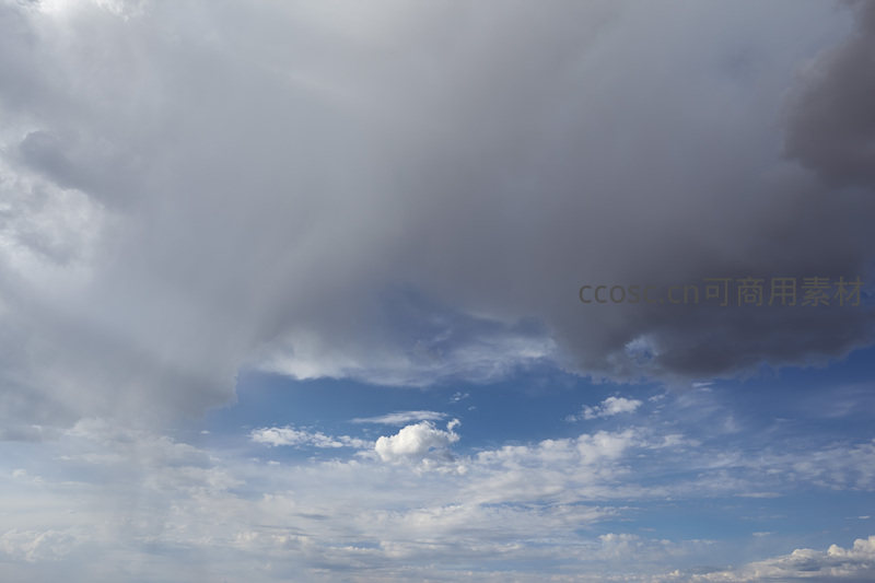 巨大灰云笼罩下的晴朗蓝天一角
