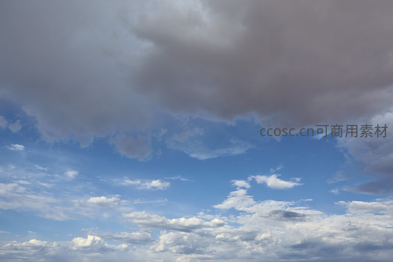 上方是厚重的灰色云层,下方则是轻盈飘逸的白色碎云,两者在清澈的蓝天下形成鲜明对比,充满空间层次感。