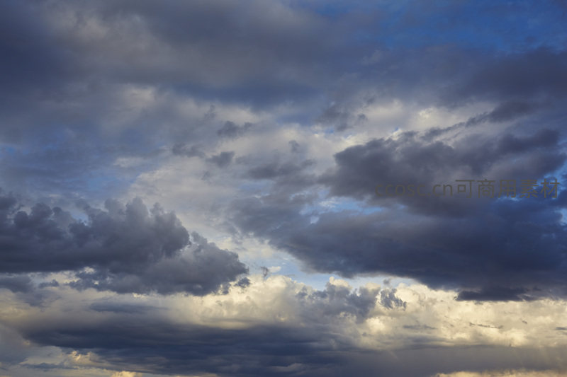 深蓝与灰黑交织的云层在黄昏时分铺满天际,阳光穿透缝隙洒下金色光束,营造出戏剧性而壮丽的视觉效果。