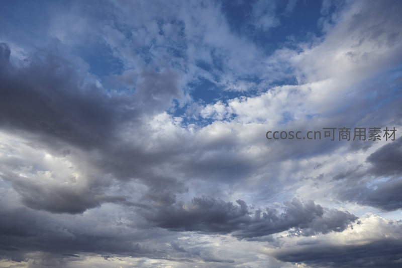蔚蓝天空中大片云层翻涌流动,灰白与深蓝交织,阳光穿透缝隙洒下柔和光束,营造出壮阔而宁静的自然氛围。