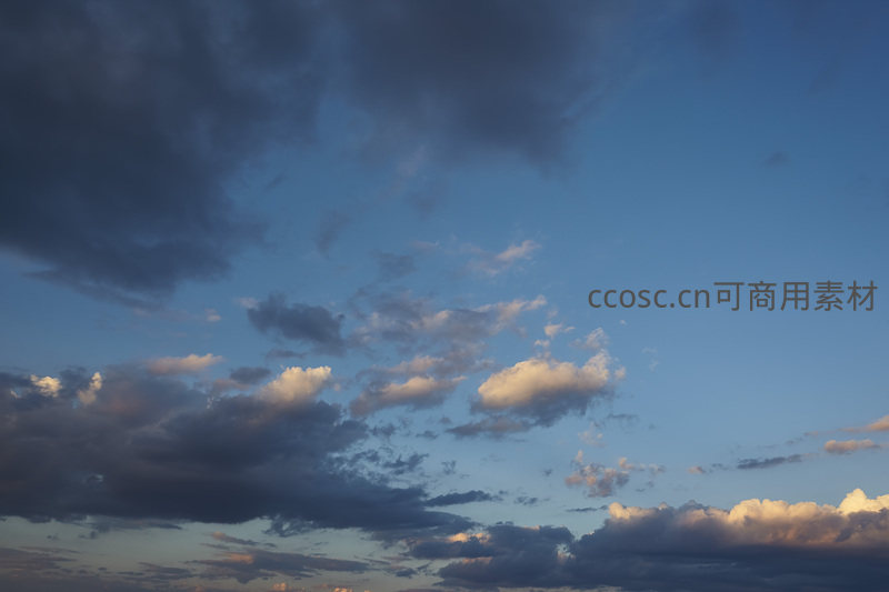 夕阳西下,厚重云团与轻盈薄云在蔚蓝天幕上共舞,暖光穿透云隙洒下斑驳光影,勾勒出一幅动态而富有诗意的黄昏画卷。