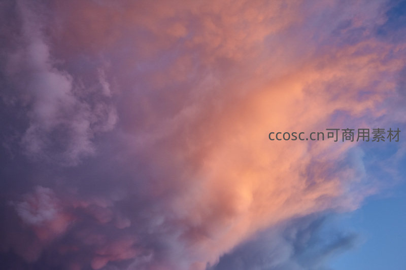 大片云层被夕阳点燃,呈现出炽热的橙红色调,与湛蓝天空形成强烈对比,云朵边缘镶着金边,气势恢宏,展现出大自然无与伦比的色彩魅力。