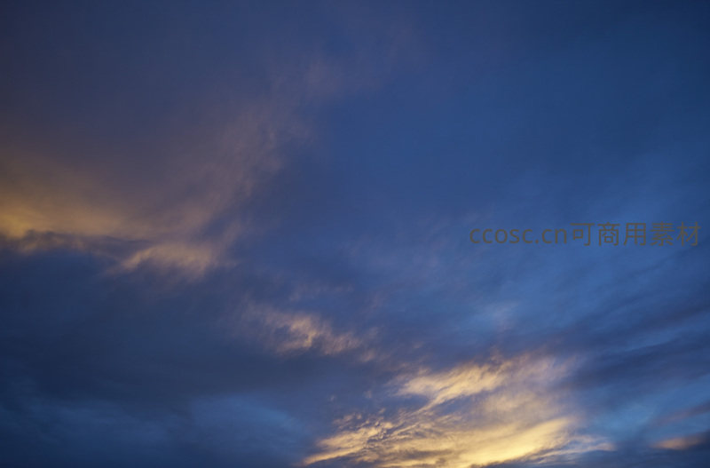 夜幕将临,深蓝色天空中云层渐厚,缝隙间透出点点金光,如星火般闪烁,营造神秘而安详的氛围。