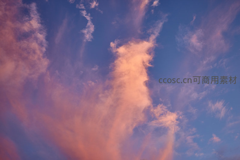 形态各异的云彩在蓝天中缓缓飘移,被夕阳镀上粉橙色光辉,如轻纱飞舞,充满动感与诗意,令人沉醉于自然之美。