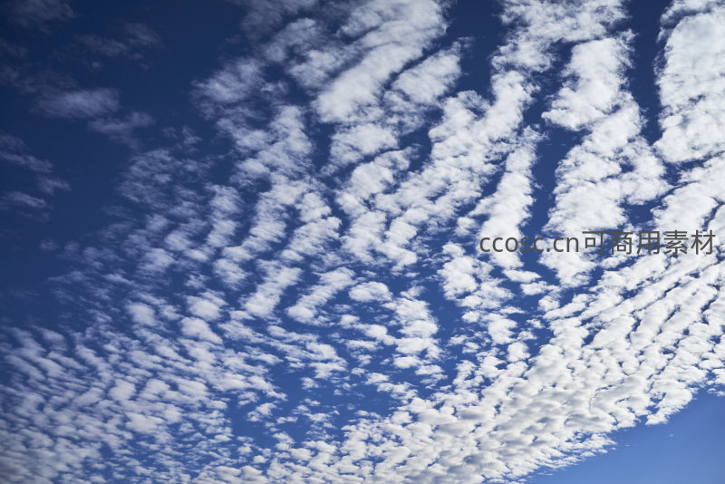 纯净的蓝色天空布满整齐排列的白色高积云,宛如鱼鳞般层层叠叠,展现出大气层中奇妙而规律的自然现象。