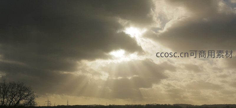 厚重的云层被阳光穿透,形成壮观的耶稣光,照亮了地平线上的树木与电线塔,营造出神圣而宁静的氛围。