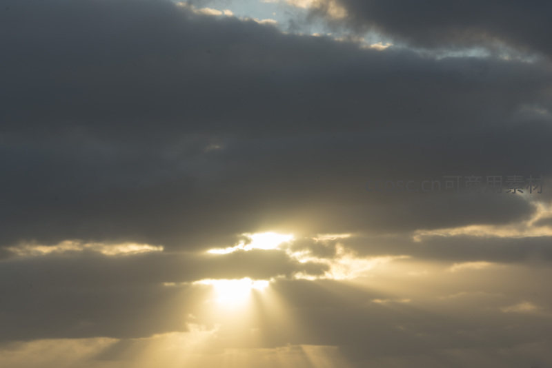 厚重的云层被阳光穿透,形成壮丽的耶稣光景象,金黄色的光线洒向大地,营造出神圣而宁静的氛围。