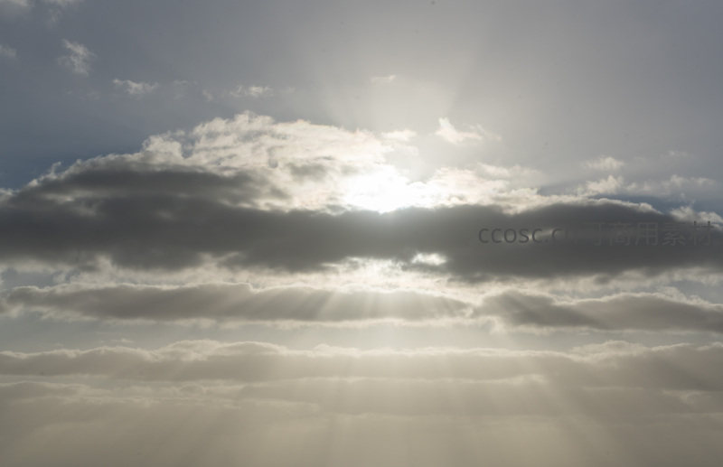 太阳位于画面中央,其光芒被层层叠叠的云朵部分遮挡,却仍散发出耀眼的光束,如同舞台追光灯般照亮天空,展现出大自然的磅礴力量。