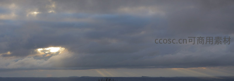 灰蓝色的云海翻涌不息,一束束金光从云隙间穿透而出,如利剑般直射地面,为广袤无垠的原野披上神圣光辉,氛围庄严而静谧。