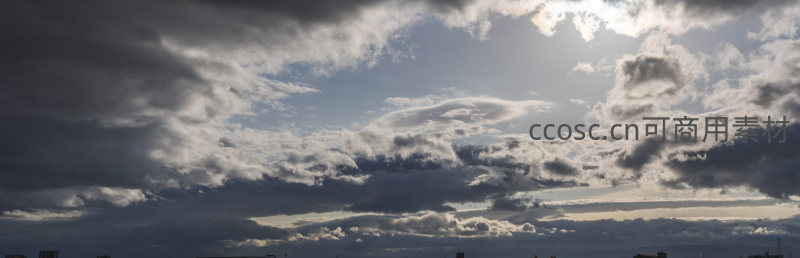 宽幅视角下,无垠的天空被层层叠叠的云朵占据,阳光从云顶倾泻而下,在云海表面形成斑驳的光点。远方城市轮廓隐约可见,尽显天地之辽阔。