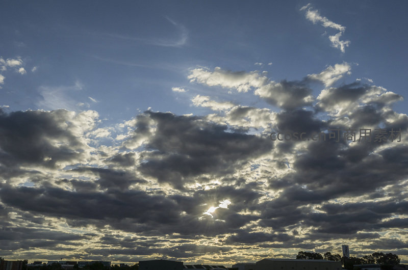 傍晚时分,太阳的光芒从厚重的云层后方透出,将云朵边缘染成金黄色,为下方的城市建筑投下柔和的暖光,营造出宁静而温暖的黄昏景象。